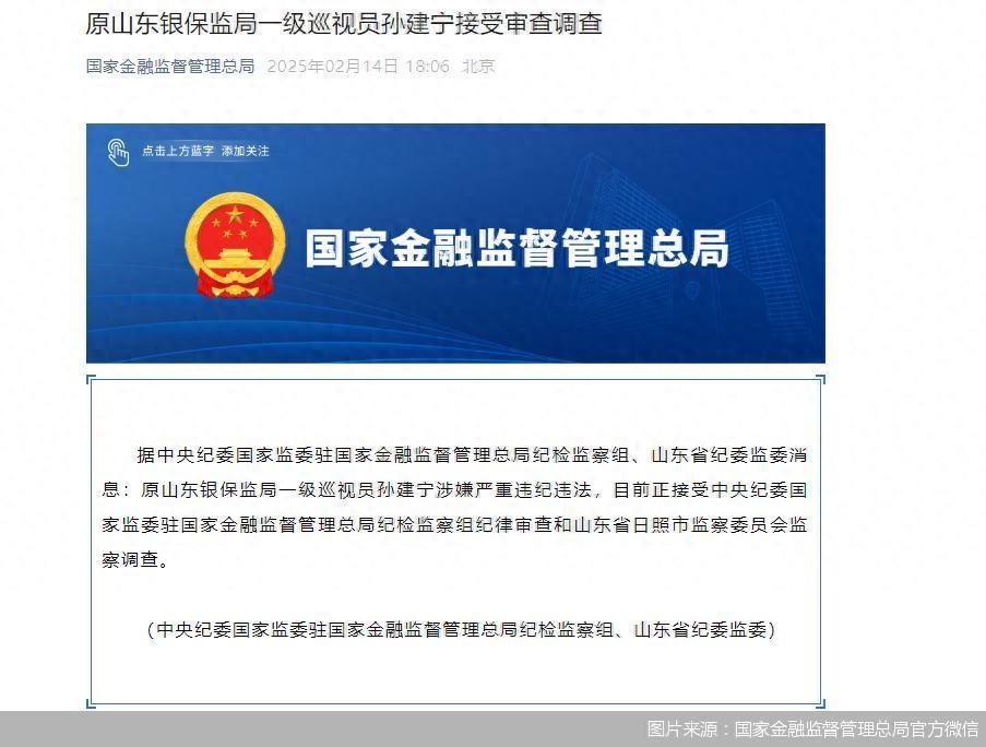 北京商报讯(记者 李秀梅)2月14日,国家金融监督管理总局消息,据中央纪委国家监委驻国家金融监督管理总局纪检监察组、山东省纪委监委消息:原山东银保监局一级巡视员孙建宁涉嫌严重违纪违法,目前正接受中央纪委国家监委驻国家金融监督管理总局纪检监察组纪律审查和山东省日照市监察委员会监察调查。